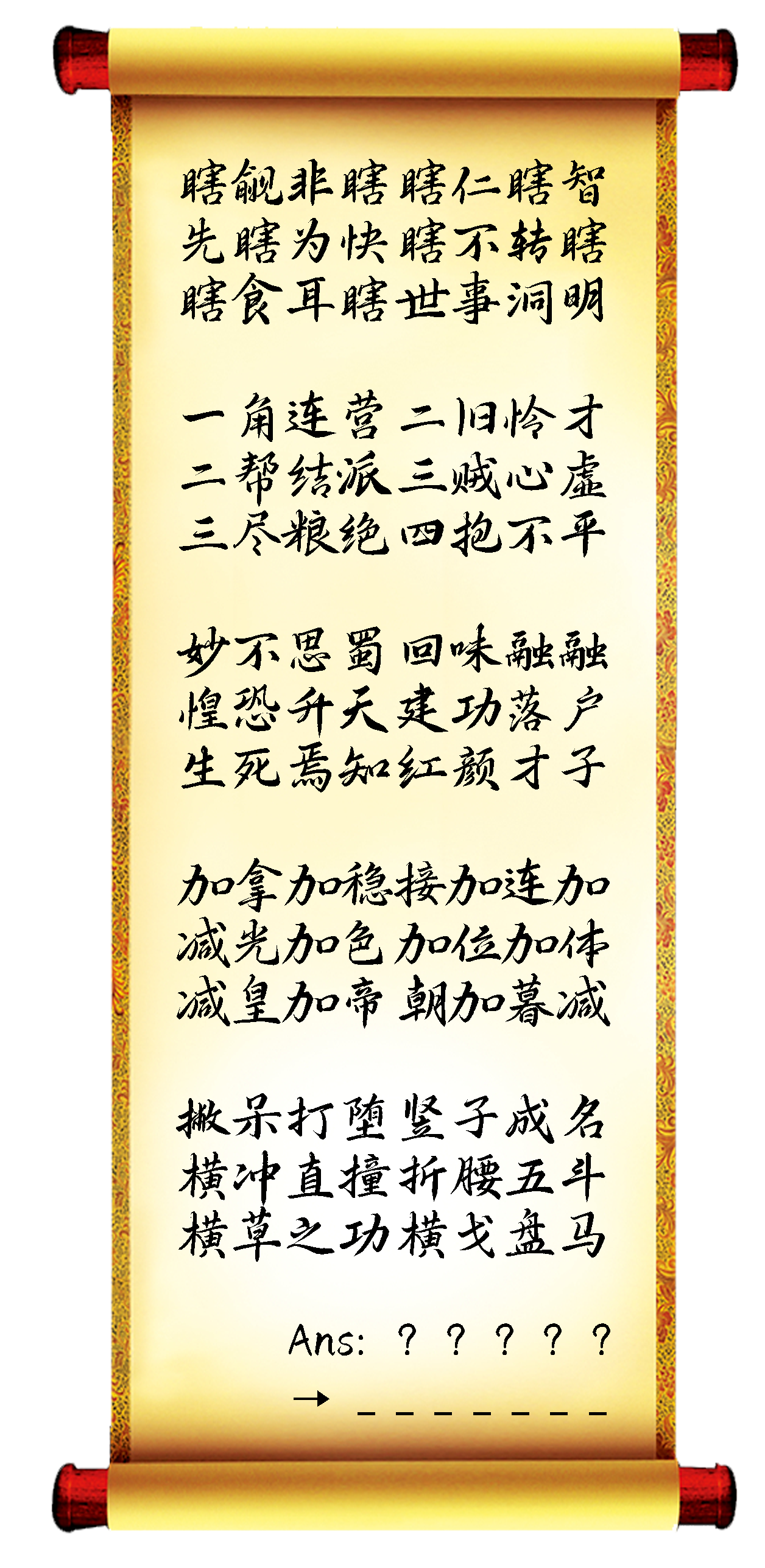 正月十五在附中(打一副词) Answer:_ _ _ _ _ _ _